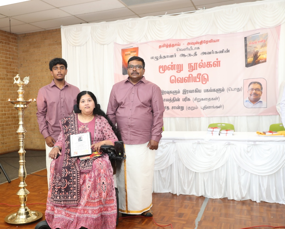 அதனைத் தொடர்ந்து, மூன்று நூல்களையும் சமநேரத்தில் வெளியீடு செய்வதற்கு ஏற்றவாறு குறுகிய காலத்தில் நூல்களிற்கான வடிவமைப்புகள், அட்டைப்பட வடிவமைப்பு, அச்சாக்கப்பணிகளைச் சிறப்புடன் செய்து பங்களித்த நிசா கிறியேசன் நிறுவனர் நிசாகுலன் அவர்களுக்கும் தேசப்பணியாக மூன்று நூல்களை வெளியிட்ட ஆ.ந.தீ அவர்களுக்கும் மதிப்பளிப்பு விருதை சிட்னி தமிழர் ஒருங்கிணைப்புக்குழுப் பொறுப்பாளர் ஜனகன் அவர்கள் வழங்கி வைத்தார்.